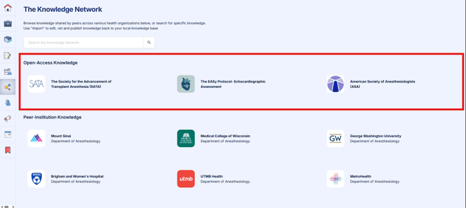 The Open-Access section of the Knowledge Network contains knowledge from societies and organizations that are available to all C8 customers. At this time, content from the ASA, EASy Protocols, and SATA are available for all users of C8 health.