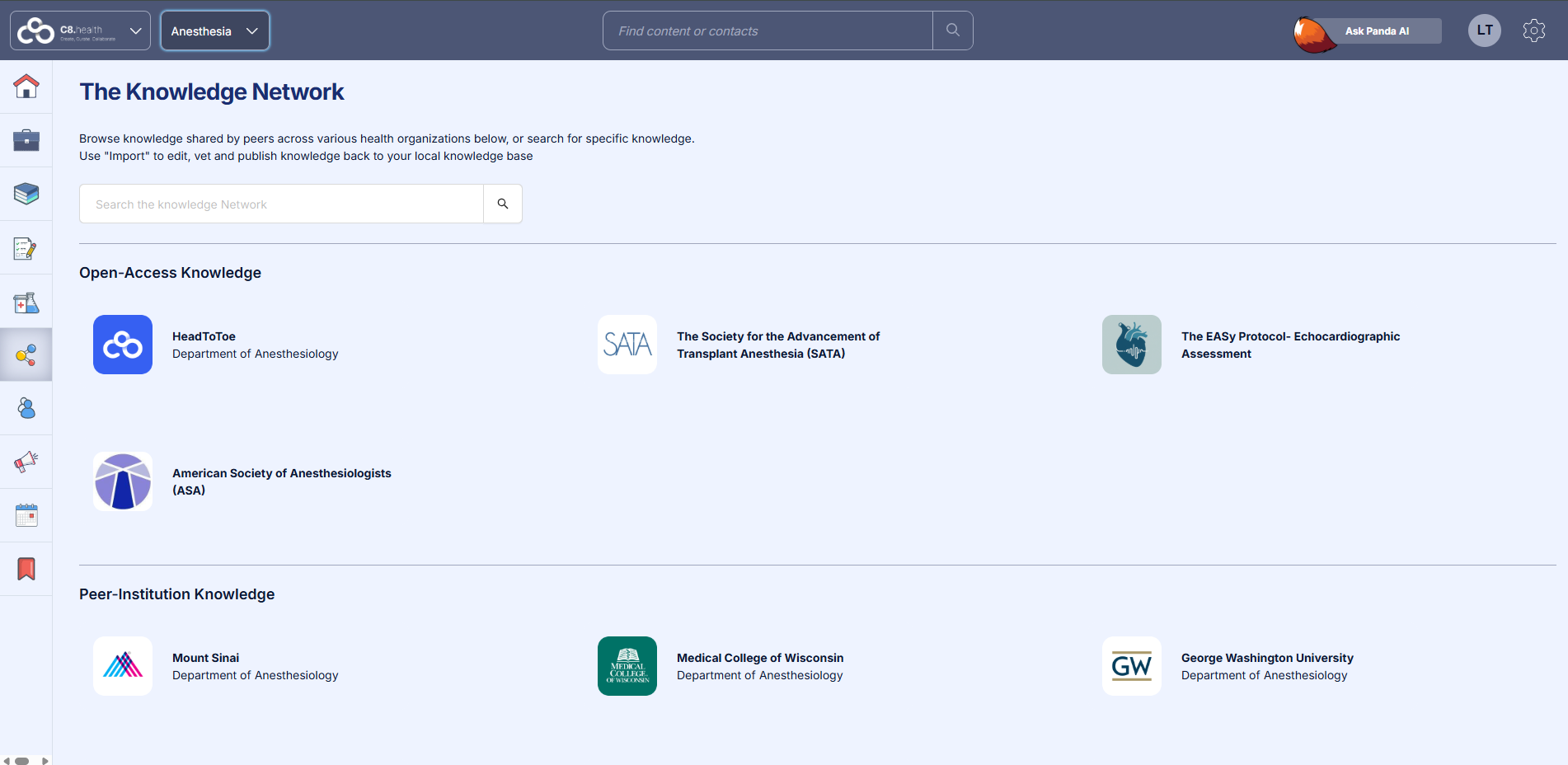 The Knowledge Network allows you to share your clinical resources and easily access content shared by peers at a network of other institutions around the country. The Network is a novel way for clinicians around the U.S. to share and collaborate around guidelines and best practices. Admins and collaborators of participating institutions can access the Knowledge Network.