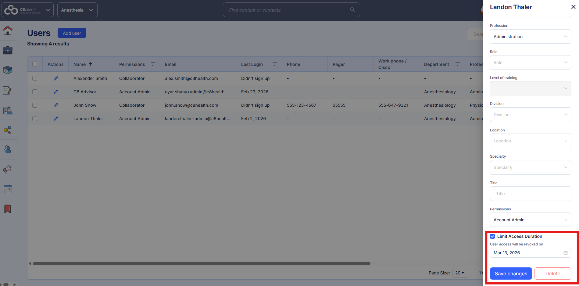 - By default, users are organized by date added to C8 Health, though you can sort by clicking on the column headers (including first name, last name, and more)