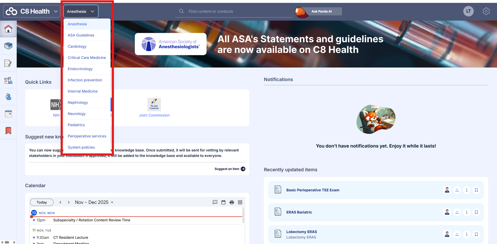 Workspaces are separate but linked spaces in C8 Health. Having multiple workspaces enables separate units in your institution to organize their knowledge in context for quick access.